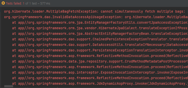 두 개 이상의 ToMany 관계의 엔티티를 불러오면 다음과 같이 MultipleBagFetchException 이 발생한다.