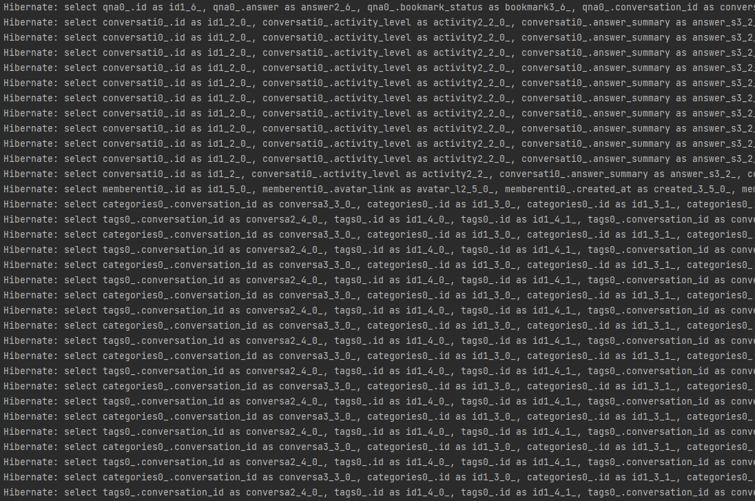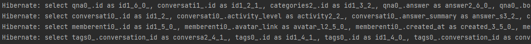 conversation과 category는 @EntityGraph로 즉시로딩하여 불러오고 tag는 hibernate.default_batch_fetch_size를 통해 IN문으로 한번에 불러온 결과 쿼리문은 다음과 같다.