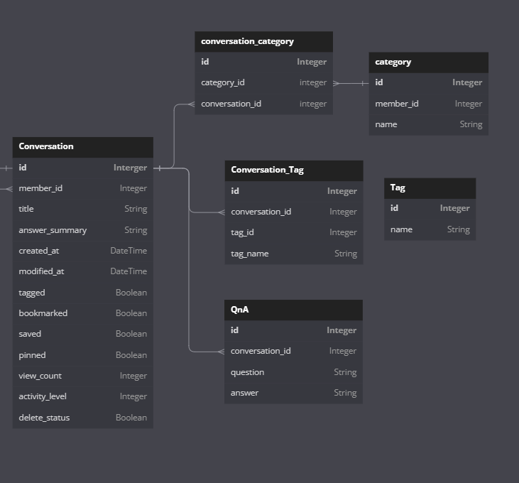 여러 QnA가 모여 하나의 대화방(Conversaiton)을 이루는 구조이고 대화방은 카테고리와 태그를 갖는다.